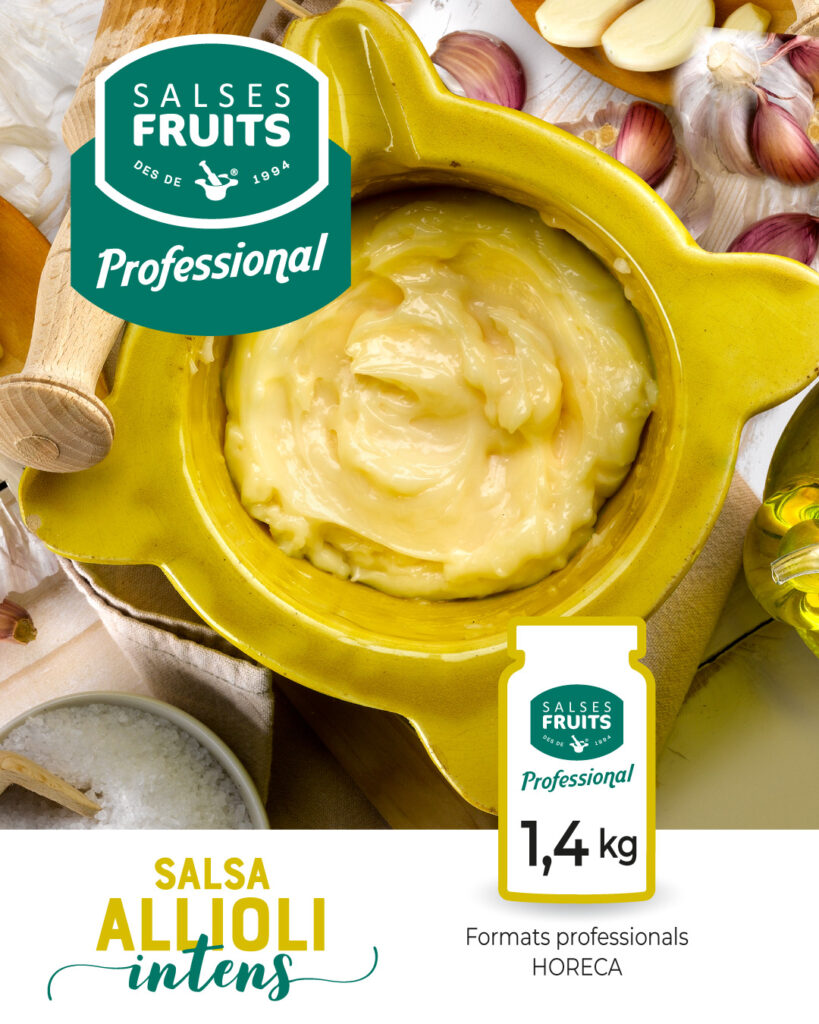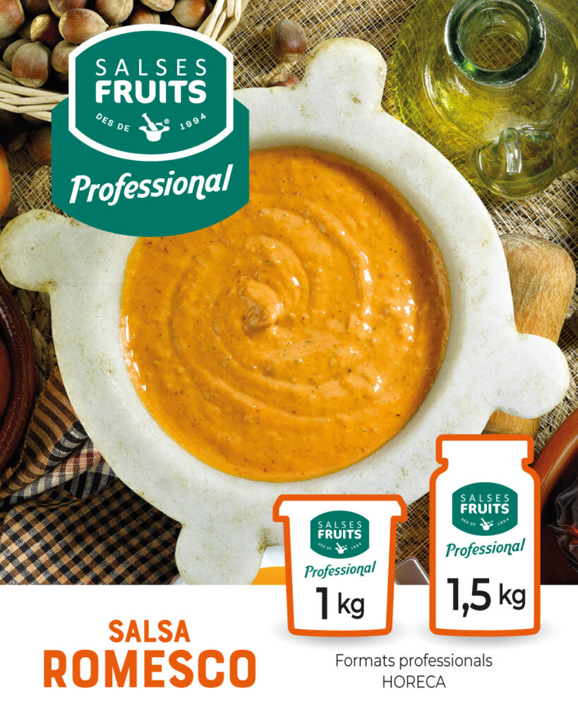 Entre los productos de SALSES FRUITS PROFESSIONAL encontramos las tradicionales salsas como el romesco y la salsa calçotada en formatos de 1 kg y de 1,5 kg; los dos aliolis en formatos de 1,4 kg; o la salsa verde en un envase biberón de 0,950 kg; junto con propuestas más creativas como la salsa brava en formato de 1,5 kg, y el pesto en formato de 1 kg, que se adaptan a los gustos y necesidades de cada cocina.
